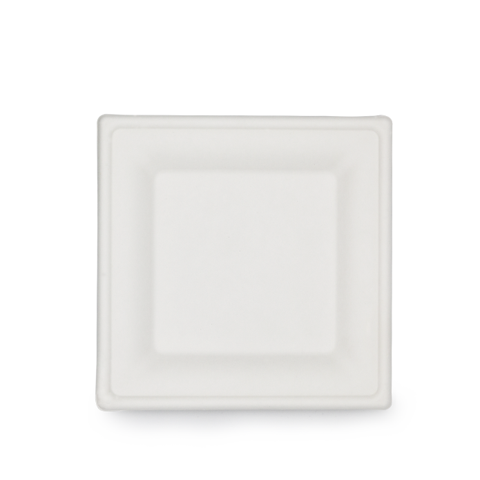 Firkantet sukkerrørsfiber tallerken med fordybning i midten i bionedbrydeligt materiale.